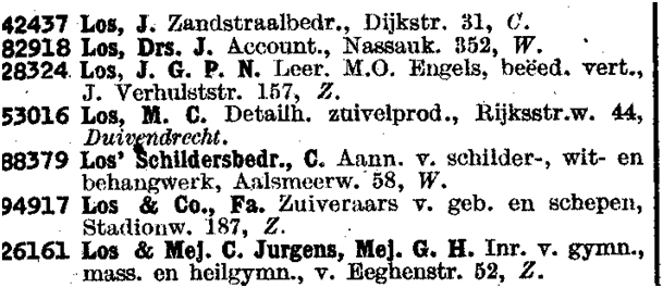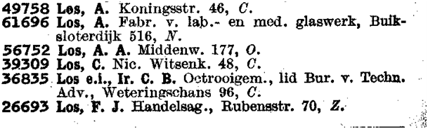 Een scan van een bladzijde uit het telefoonboek van Amsterdam 1950 werd mij toegestuurd door Annemieke Groot ( 25 % Los).